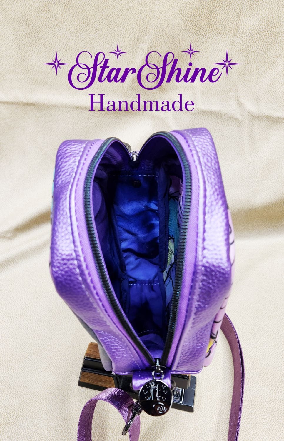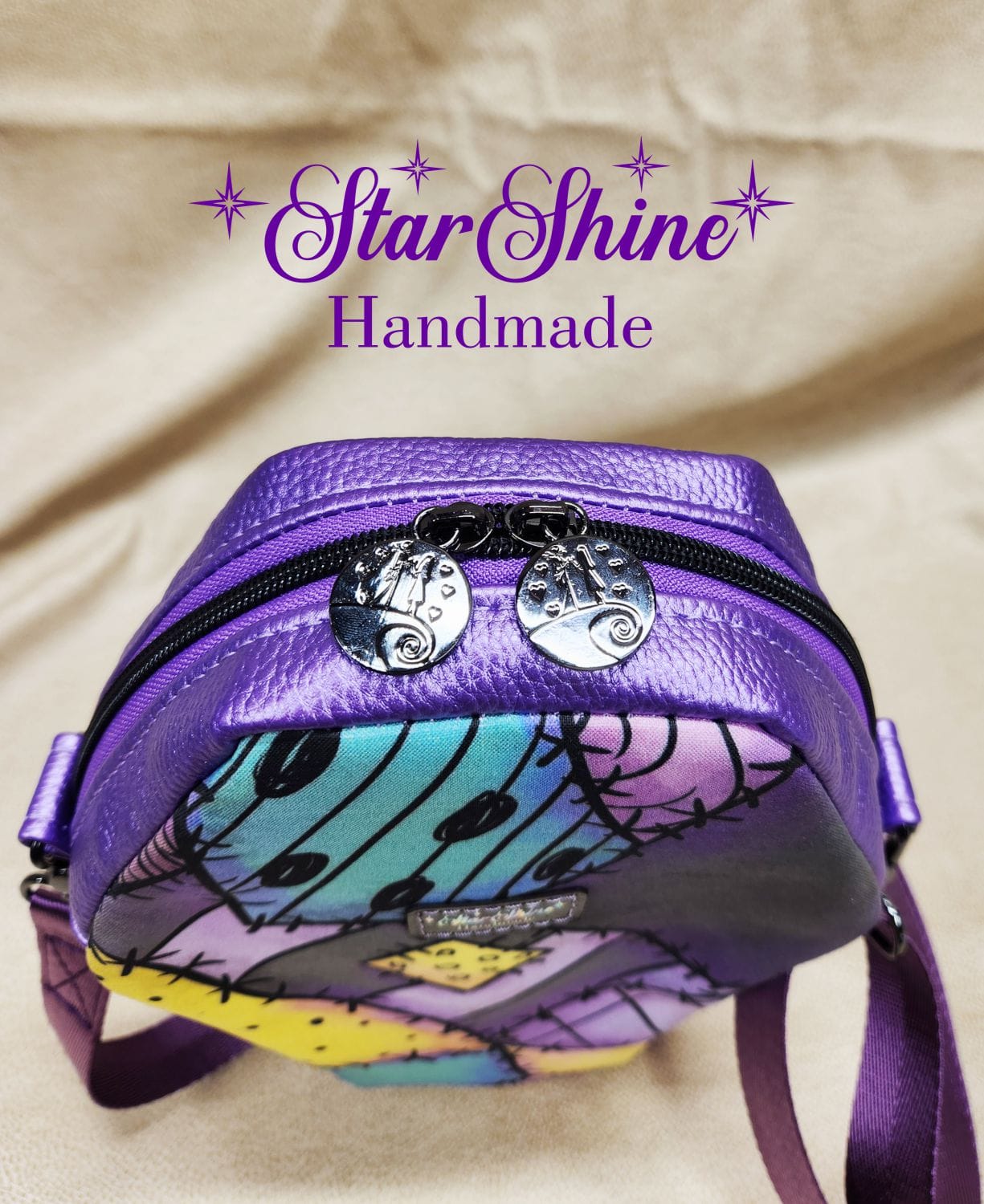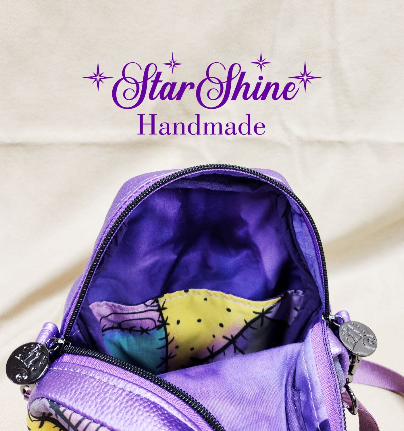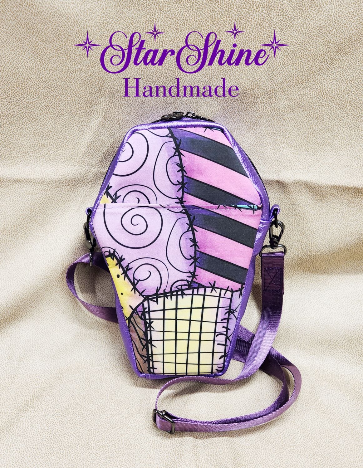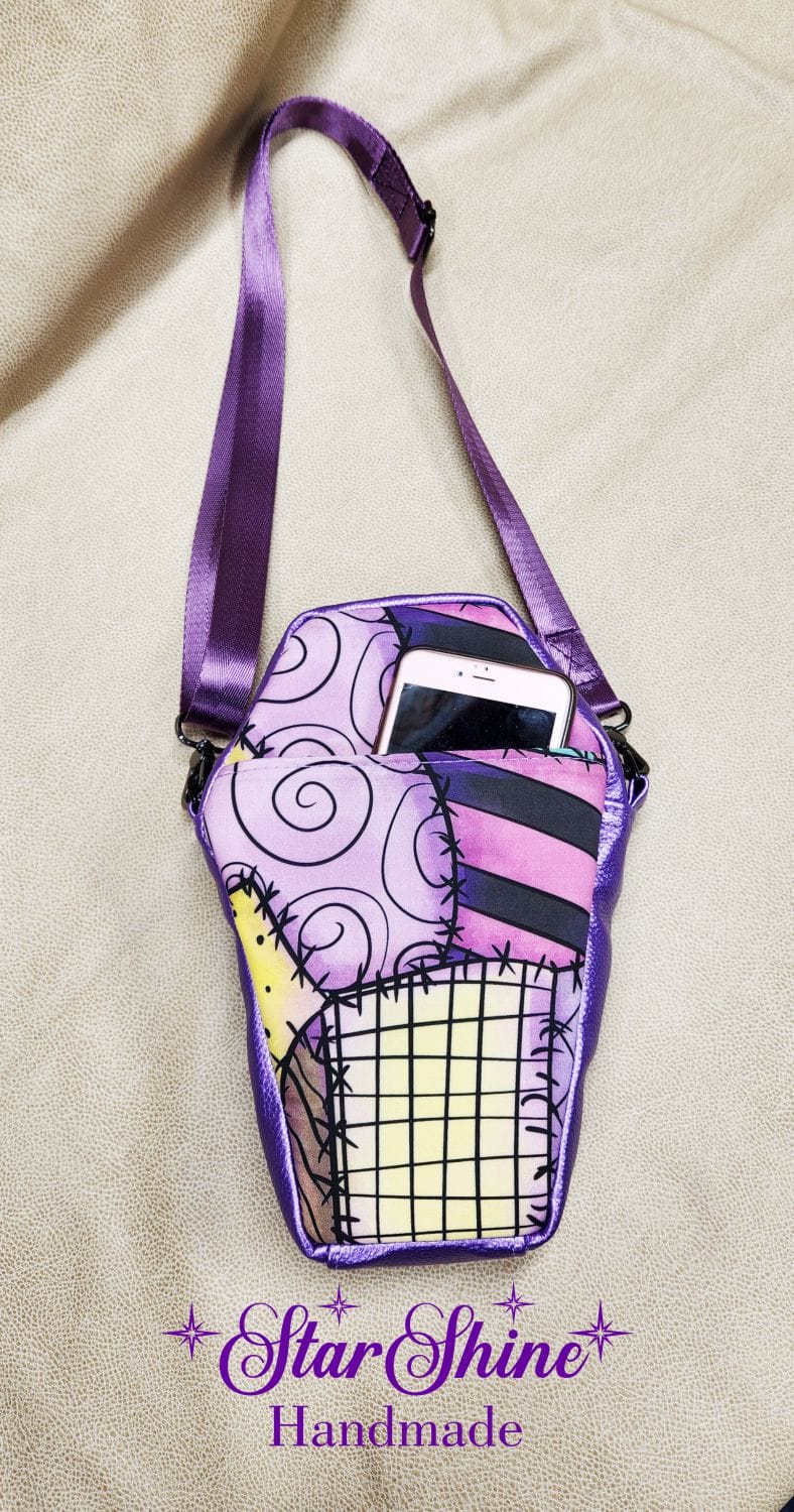 NBC Sally Printed Coffin Crossbody. Reminiscent of the classic character Sally, from The Nightmare Before Christmas. Colorful printed Sally print on the front and back panels are created with Signature Petal Cotton woven material. The top, sides and bottom are in a luscious seashell faux leather in purple. Gunmetal hardware throughout. The back of the exterior has a large slip pocket that is perfect for storing your phone or other items you need easy access to. Purple and gunmetal top zipper closure with dual Nightmare Before Christmas zipper sliders. Removable and adjustable strap is perfect for crossbody or shoulder wear. It is constructed with purple heavy duty seatbelt webbing.