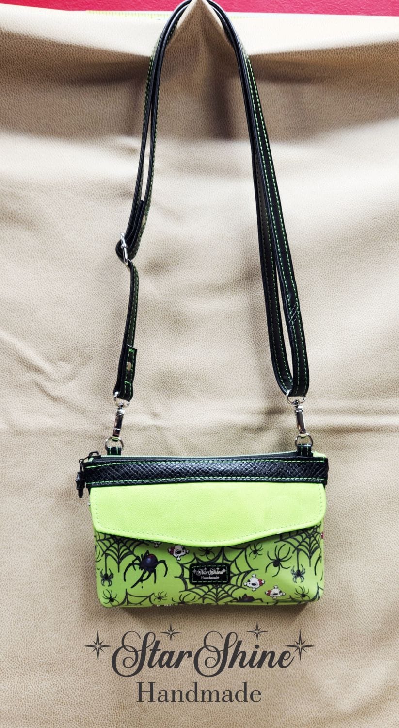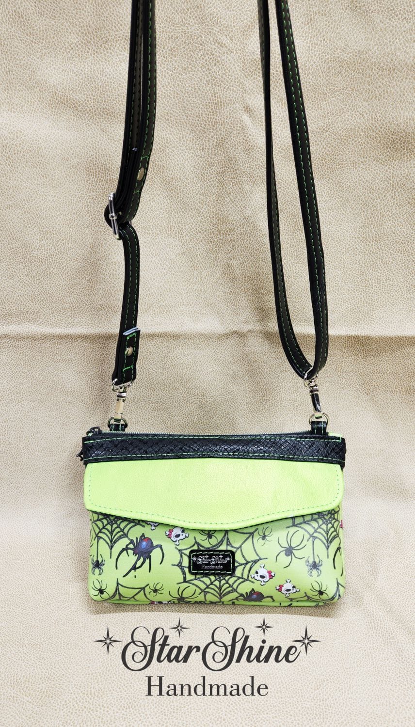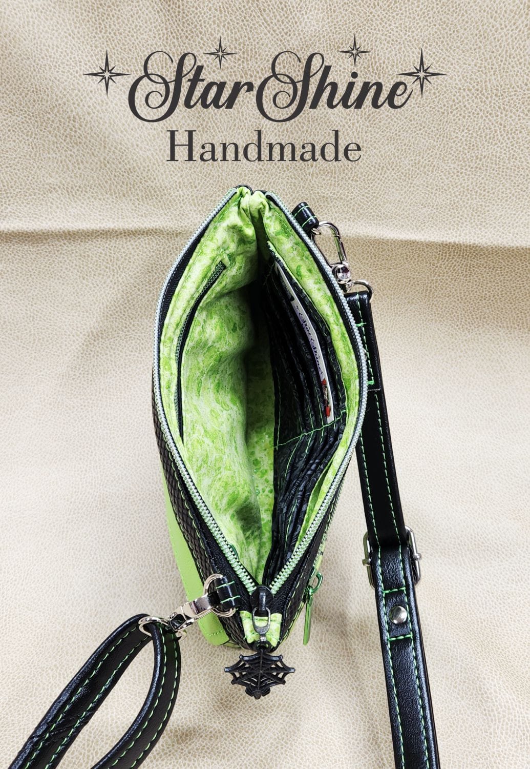 Neon Green and Black Cell Phone Wallet Bag . Perfect for Halloween or inspiring your inner Gothic mood! This highly functional crossbody bag holds all of your essentials while boasting gorgeous contrasting colors. The main body is constructed with a playful skull and spiderweb printed green faux leather. The flap is also faux leather, in a metallic neon green color. The top band of the exterior is made with faux leather in a metallic accented reptile texture. Soft black, removable and adjustable crossbody strap has neon green accent stitching for a beautiful pop of coordinating color. Silver and anodized green hardware.