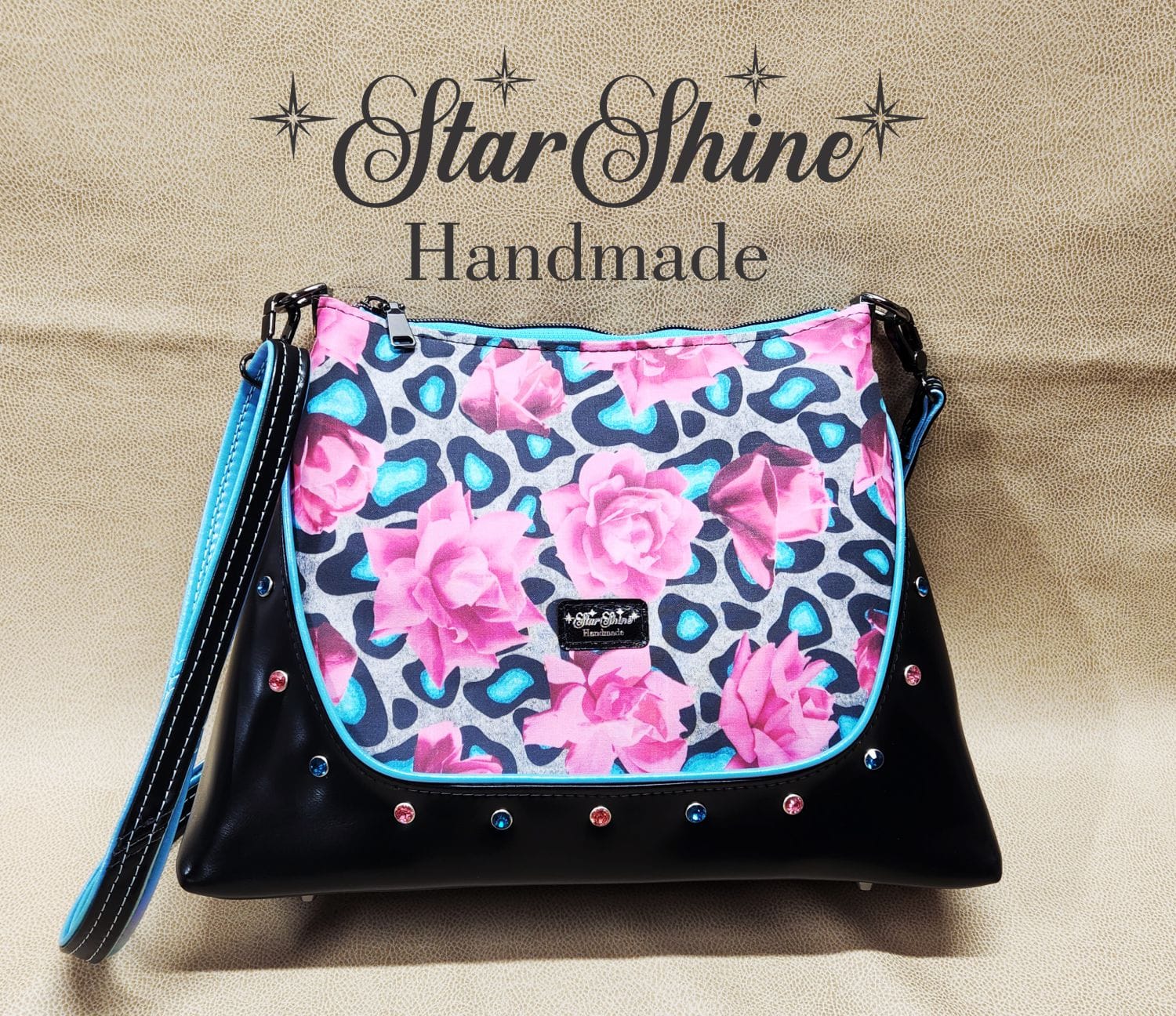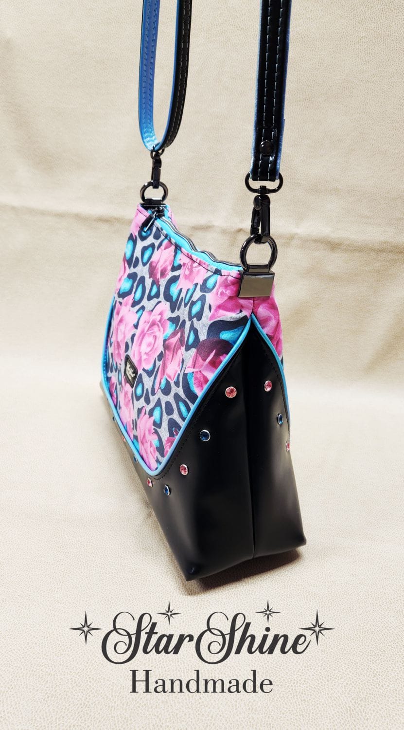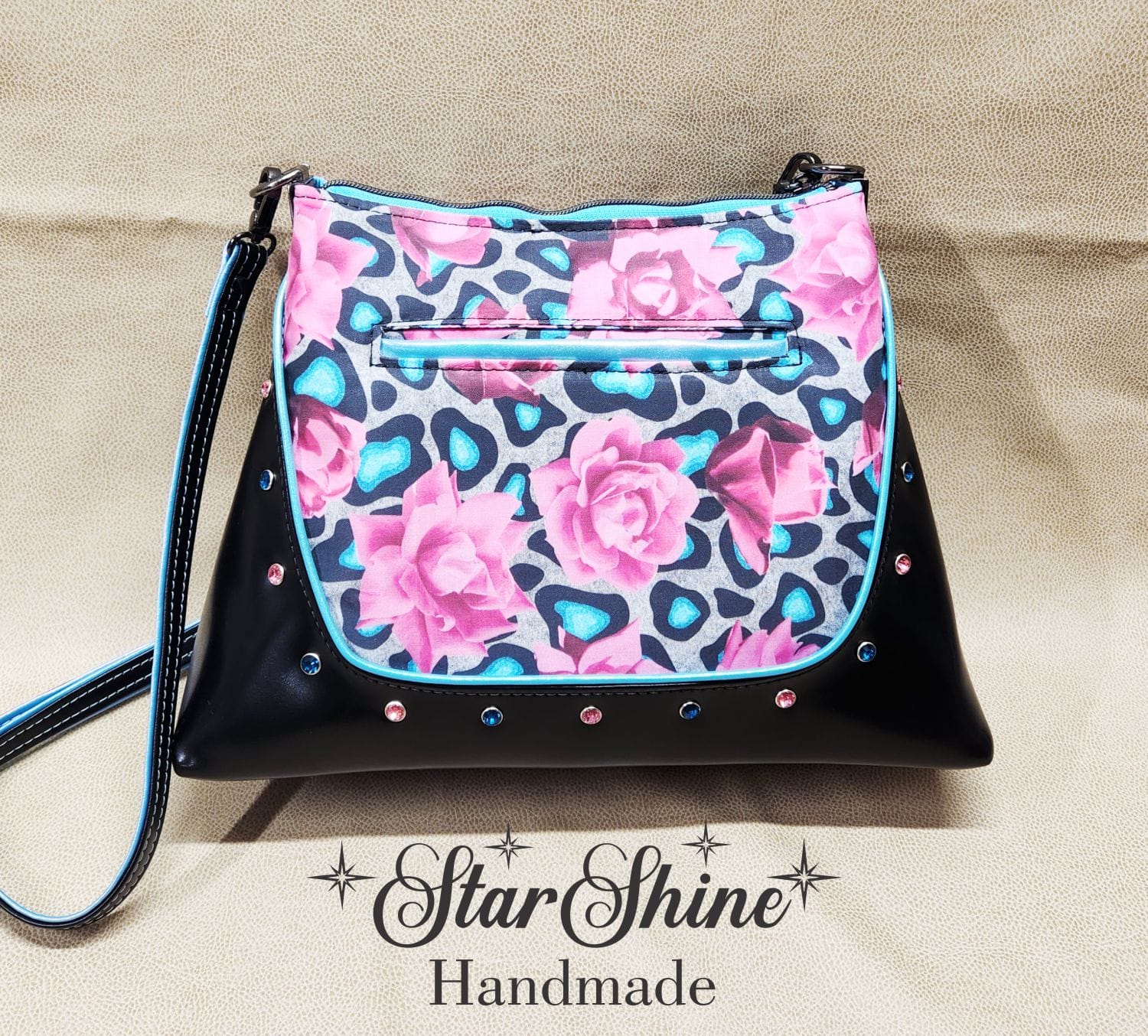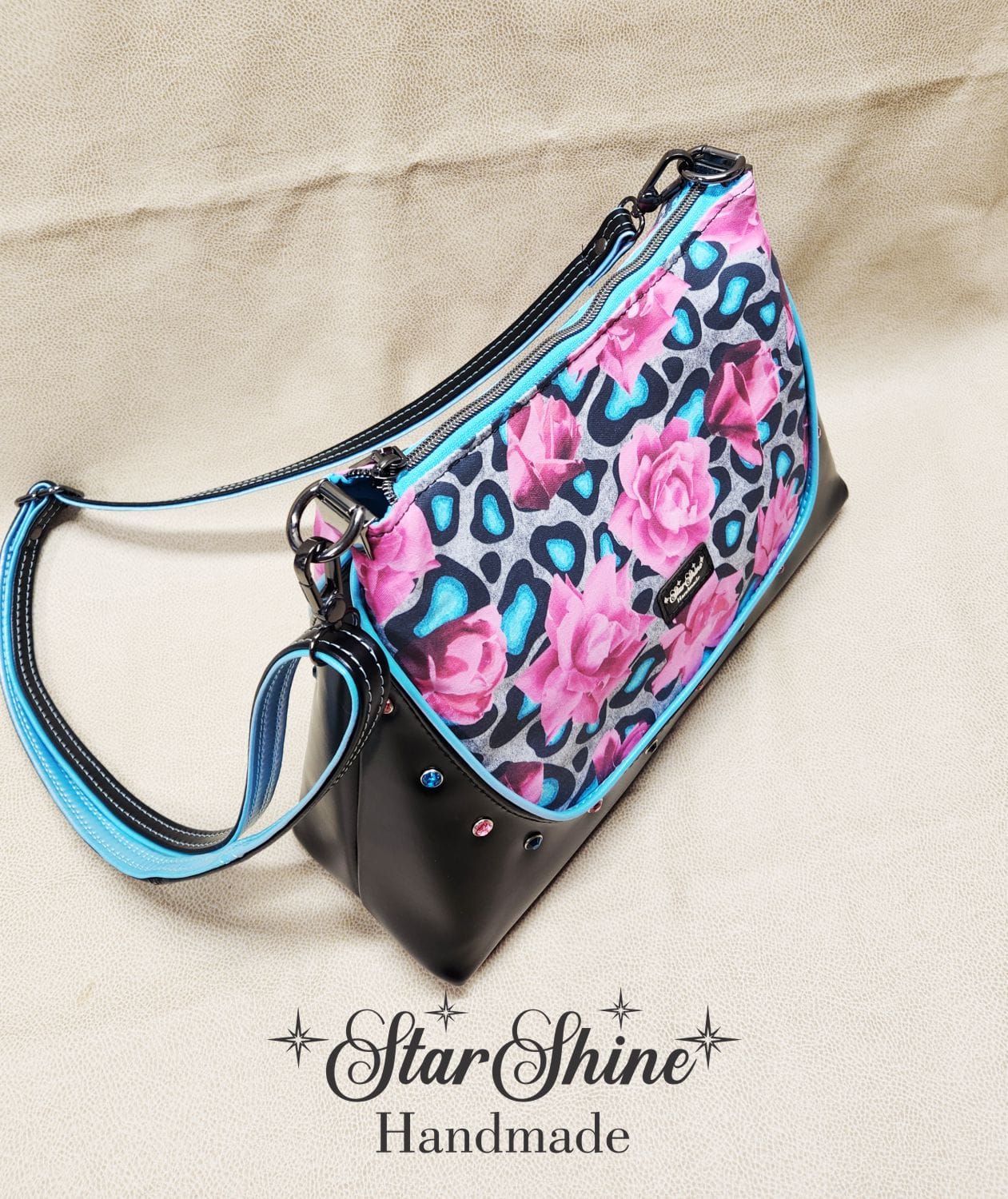 Pink and Aqua Leopard Handbag. This colorful and stunning handbag is for all occasions where you just want to shine your light into the world. A classic beauty with aqua and pink rhinestone rivets that sparkle and shine. Black satin sheen faux leather bottom and sides. Main panels are Signature Petal cotton in a sassy pink and aqua floral leopard print. Luminous aqua faux leather piping adds something extra special to this appealing design. The two toned strap in black and aqua is both removable and adjustable for either crossbody or shoulder wear. Aqua accent stitching on the strap to fully coordinate with the colors. Gunmetal hardware throughout, including bag feet to protect the bottom from dirty surfaces and wear. The back exterior has a welted slip pocket with luminous faux leather accent top. Perfect for cell phones and other items that need to be easily accessed.