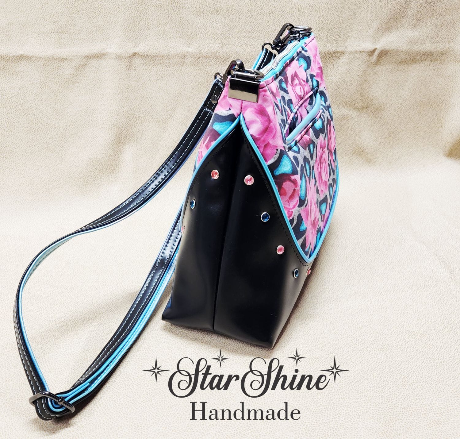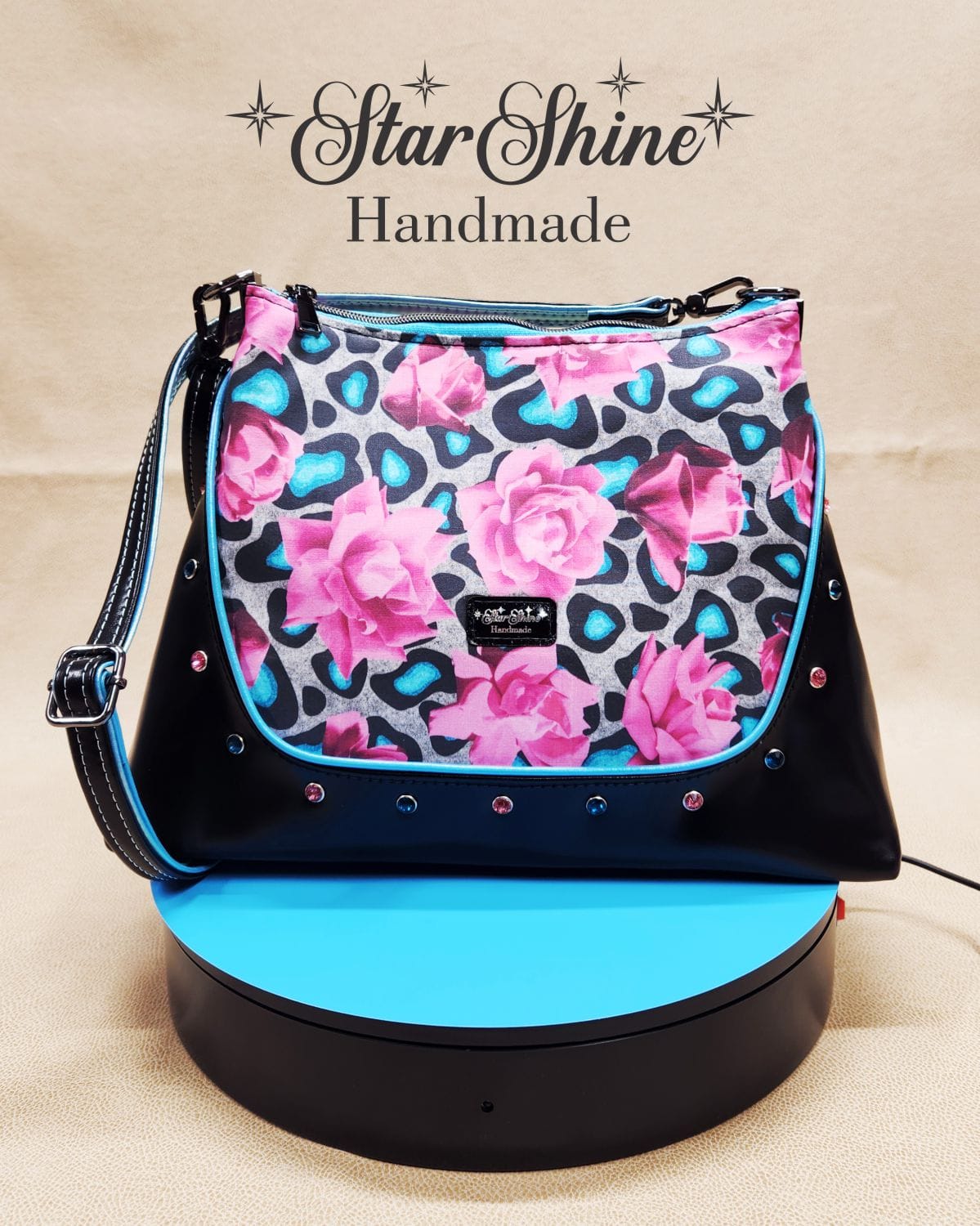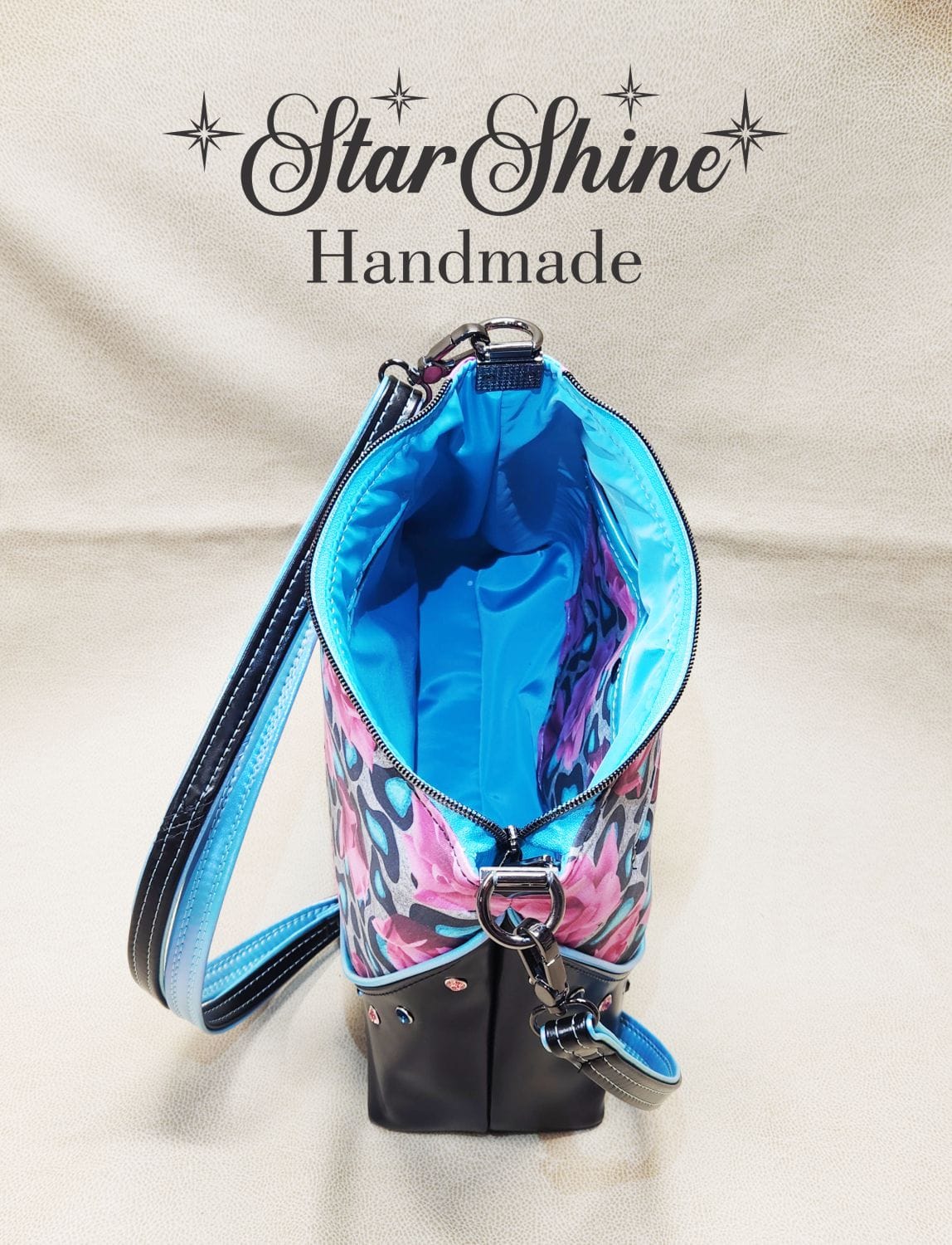 Pink and Aqua Leopard Handbag. This colorful and stunning handbag is for all occasions where you just want to shine your light into the world. A classic beauty with aqua and pink rhinestone rivets that sparkle and shine. Black satin sheen faux leather bottom and sides. Main panels are Signature Petal cotton in a sassy pink and aqua floral leopard print. Luminous aqua faux leather piping adds something extra special to this appealing design. The two toned strap in black and aqua is both removable and adjustable for either crossbody or shoulder wear. Aqua accent stitching on the strap to fully coordinate with the colors. Gunmetal hardware throughout, including bag feet to protect the bottom from dirty surfaces and wear. The back exterior has a welted slip pocket with luminous faux leather accent top. Perfect for cell phones and other items that need to be easily accessed.