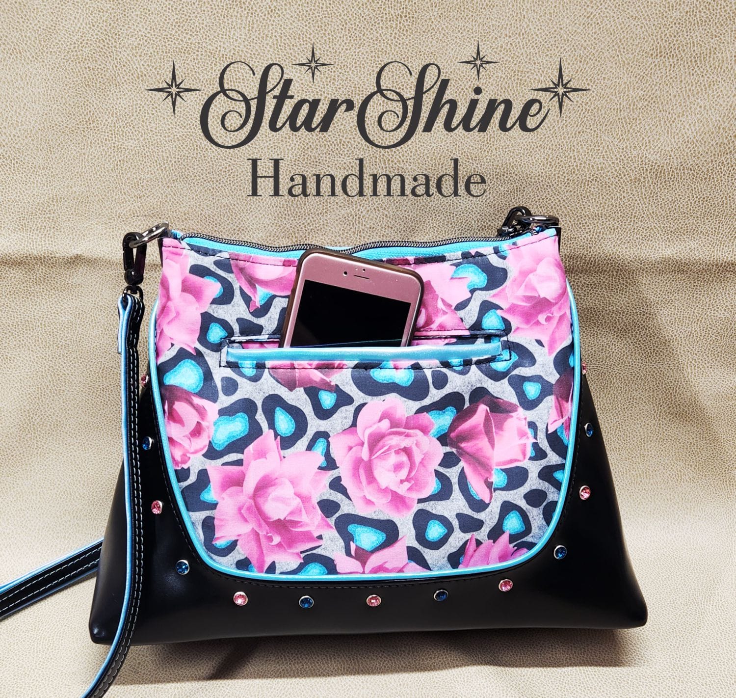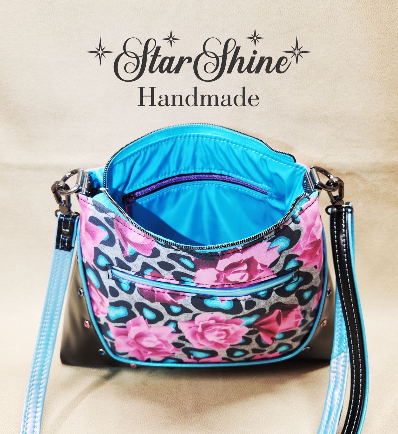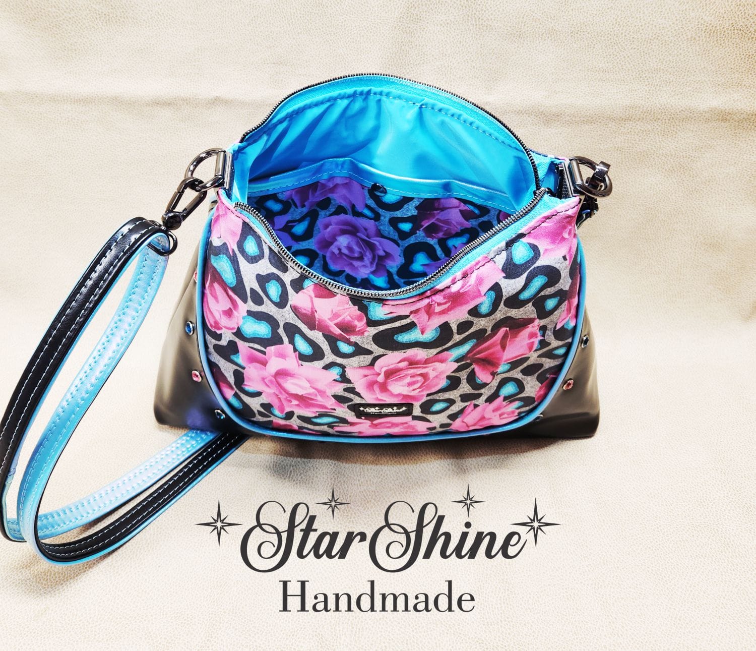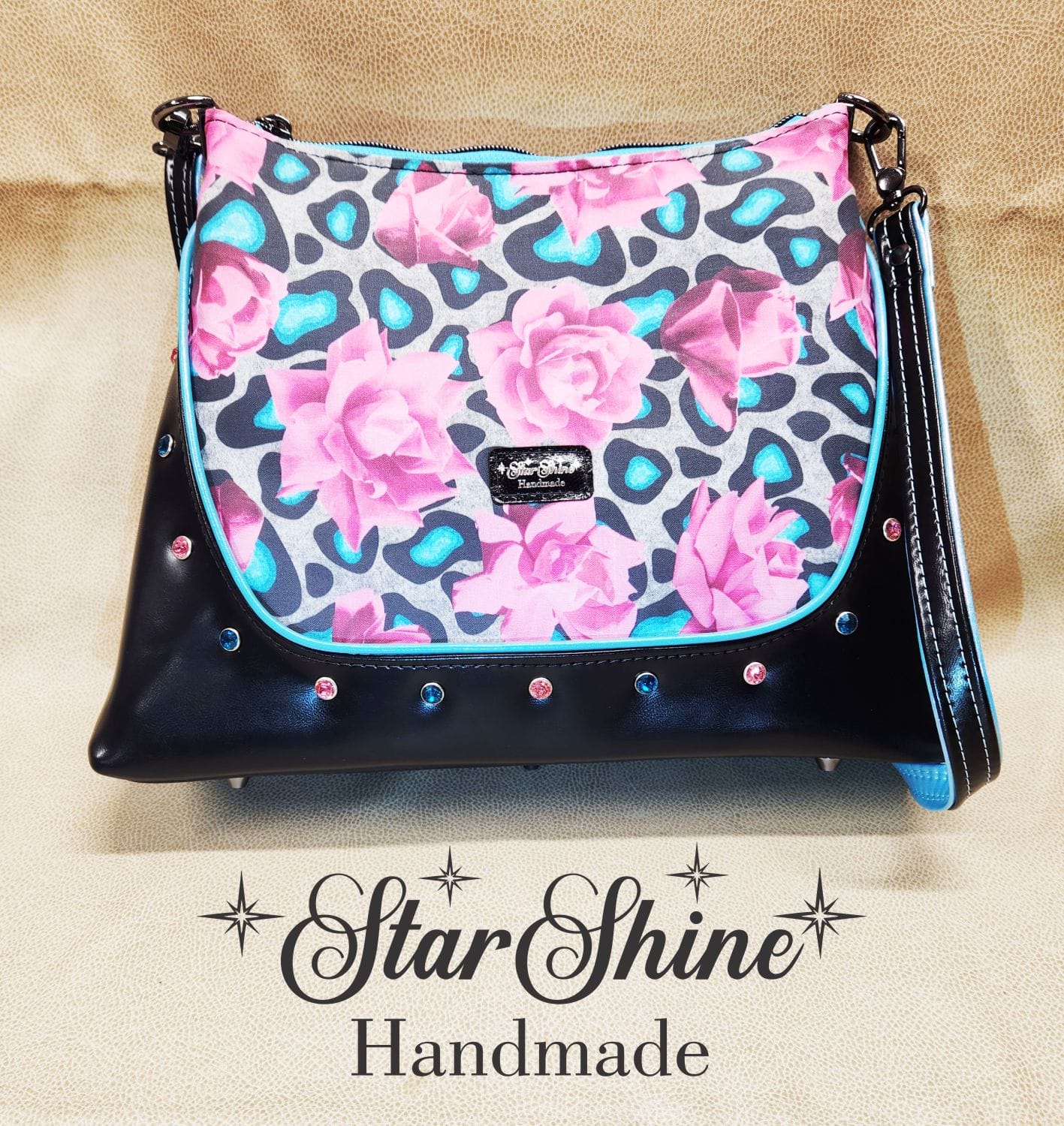 Pink and Aqua Leopard Handbag. This colorful and stunning handbag is for all occasions where you just want to shine your light into the world. A classic beauty with aqua and pink rhinestone rivets that sparkle and shine. Black satin sheen faux leather bottom and sides. Main panels are Signature Petal cotton in a sassy pink and aqua floral leopard print. Luminous aqua faux leather piping adds something extra special to this appealing design. The two toned strap in black and aqua is both removable and adjustable for either crossbody or shoulder wear. Aqua accent stitching on the strap to fully coordinate with the colors. Gunmetal hardware throughout, including bag feet to protect the bottom from dirty surfaces and wear. The back exterior has a welted slip pocket with luminous faux leather accent top. Perfect for cell phones and other items that need to be easily accessed.