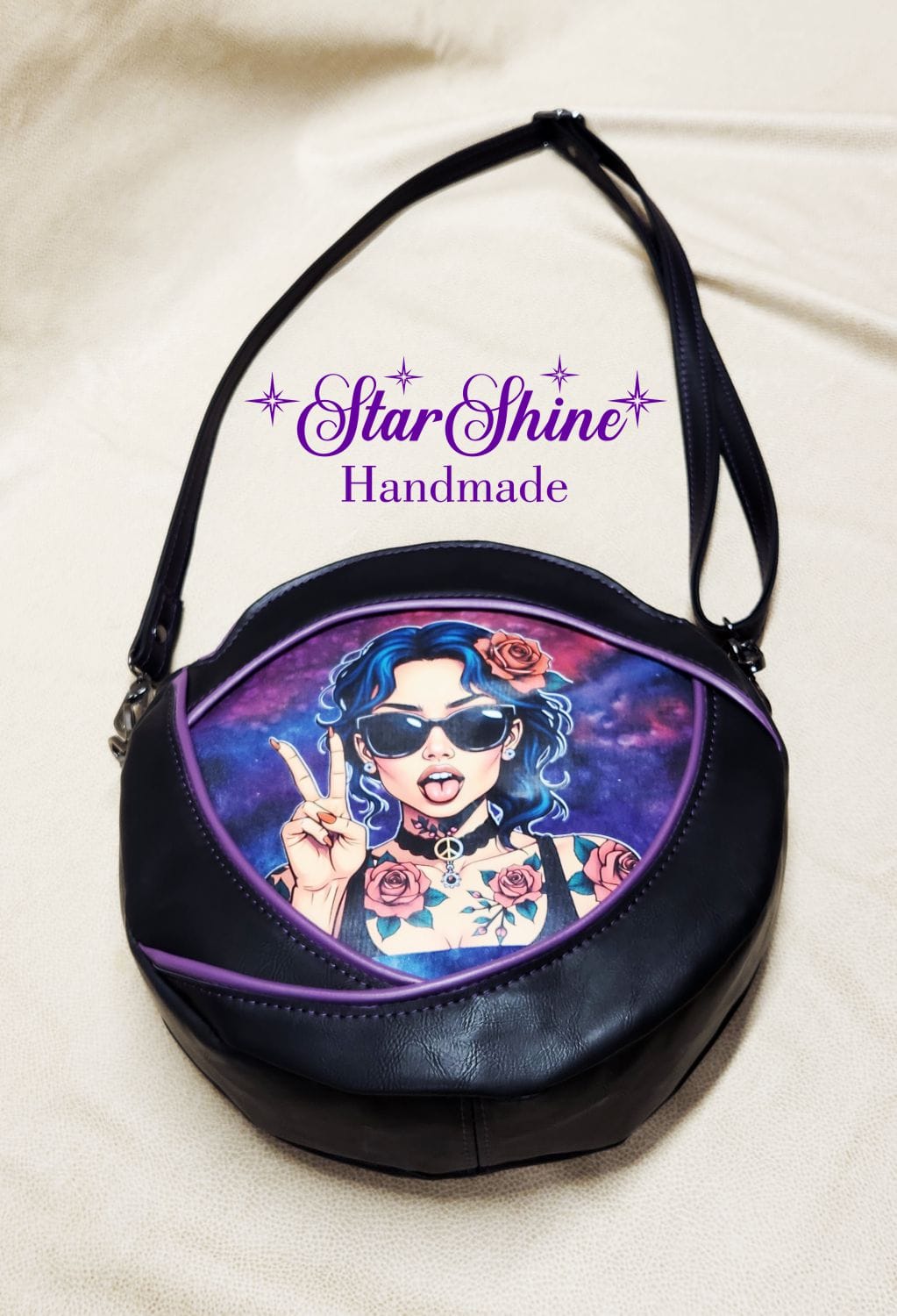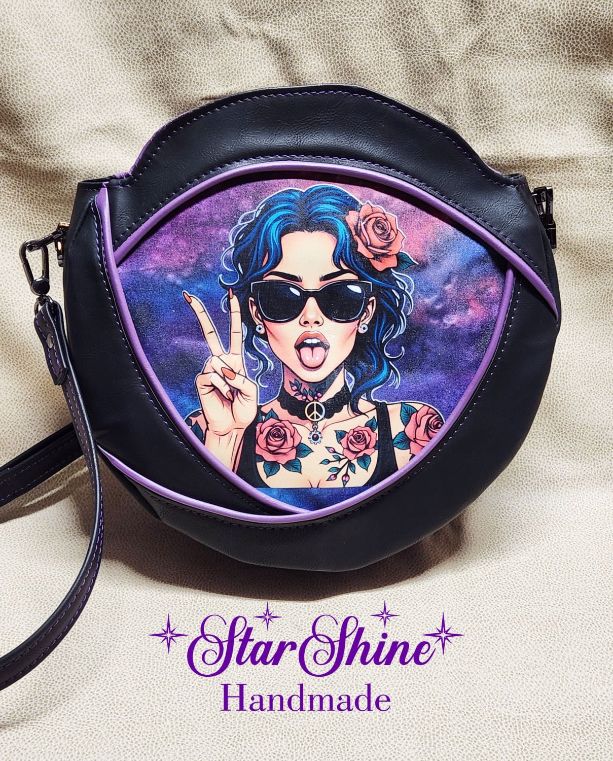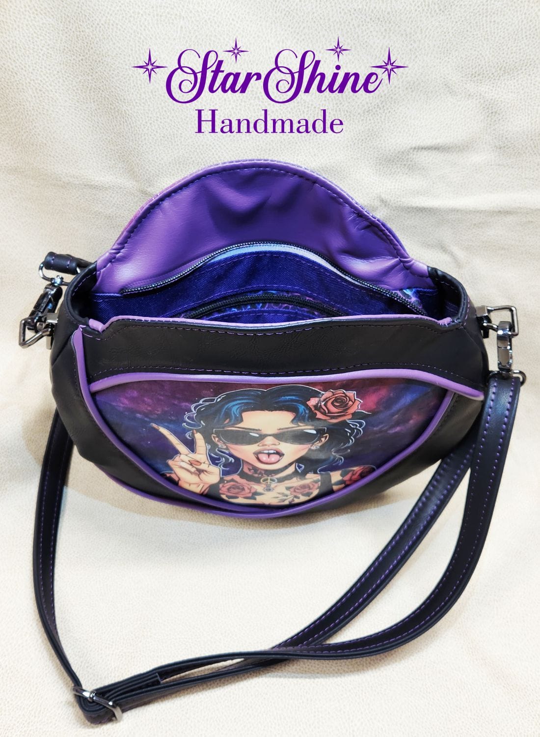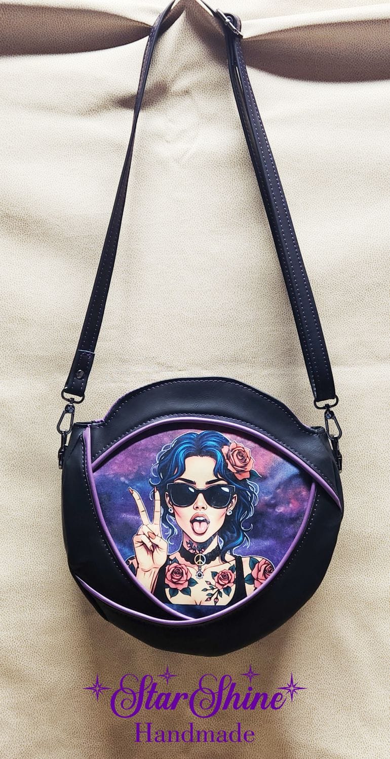 Purple and Black Anoukis Crossbody. This sassy and unique medium crossbody bag features a water/stain resistant marbled blue and purple cotton woven material. The front panel showcases an image of a brightly colored sassy girl giving the peace sign. The back has a welted slip pocket, ideal for storing your phone for easy access. Black faux leather sides and gusset and gorgeous purple faux leather piping accents that really pop. The black faux leather strap is removable and adjustable so it can be worn over the shoulder or crossbody style. This unique design and shape really stands out as a fun statement piece. Purple top stitching adds a complimentary accent.