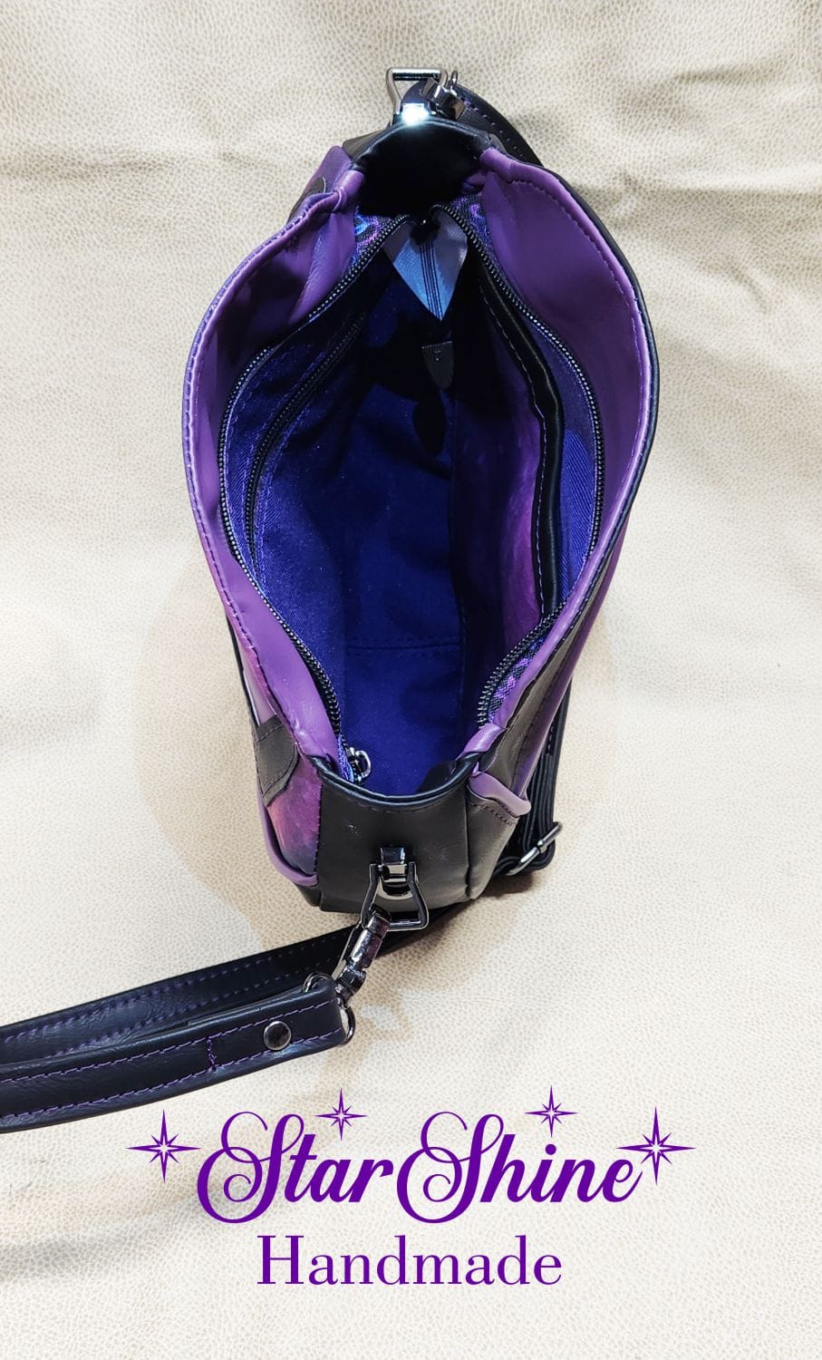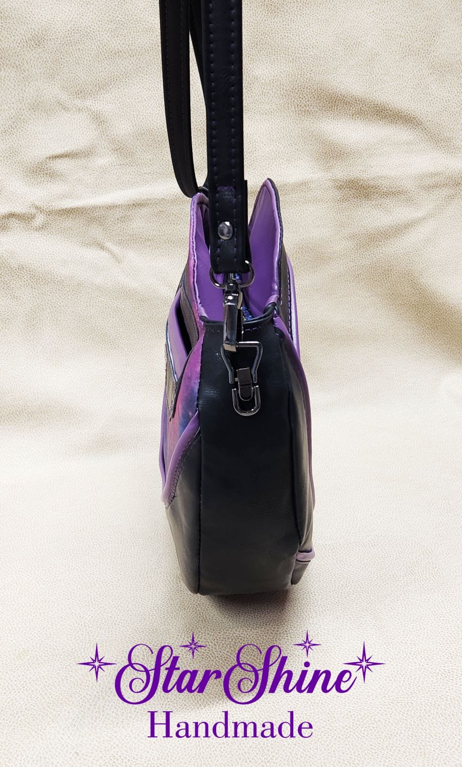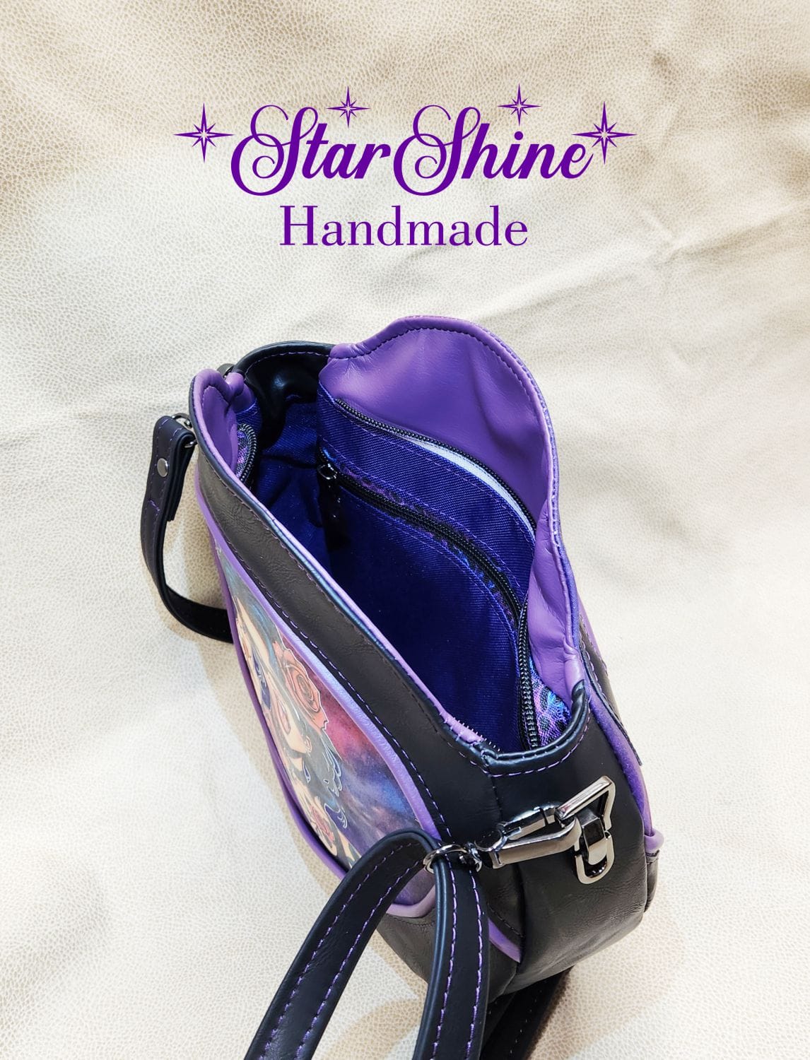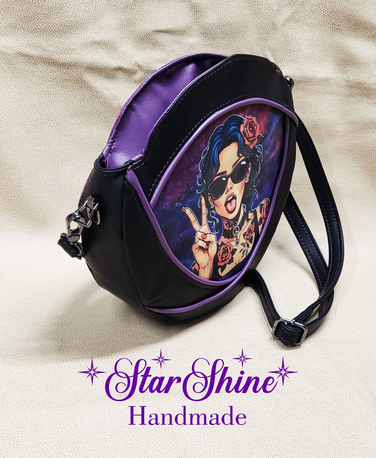 Purple and Black Anoukis Crossbody. This sassy and unique medium crossbody bag features a water/stain resistant marbled blue and purple cotton woven material. The front panel showcases an image of a brightly colored sassy girl giving the peace sign. The back has a welted slip pocket, ideal for storing your phone for easy access. Black faux leather sides and gusset and gorgeous purple faux leather piping accents that really pop. The black faux leather strap is removable and adjustable so it can be worn over the shoulder or crossbody style. This unique design and shape really stands out as a fun statement piece. Purple top stitching adds a complimentary accent.