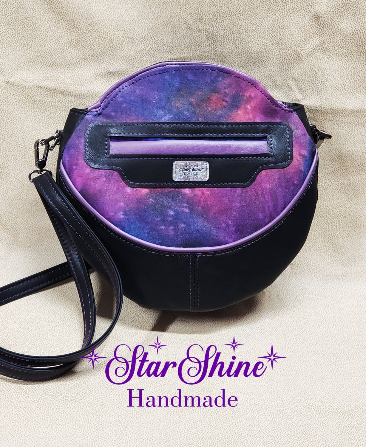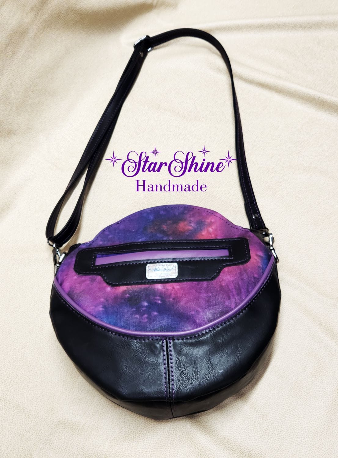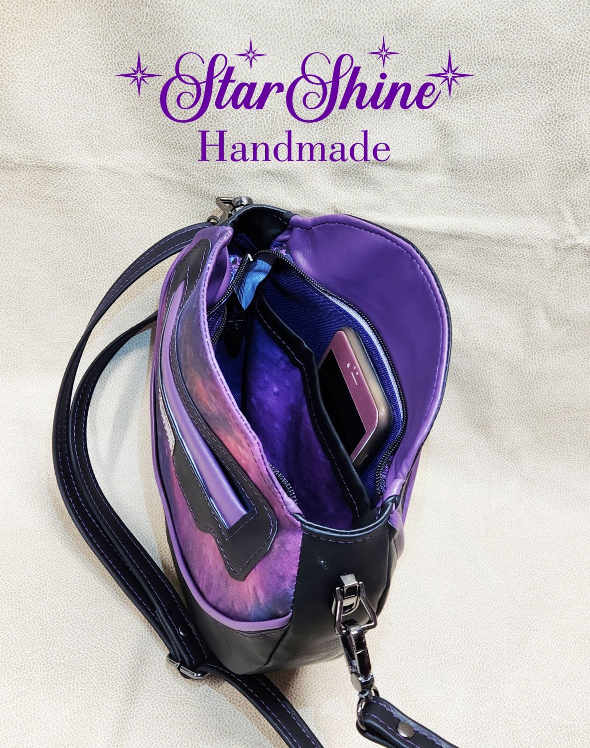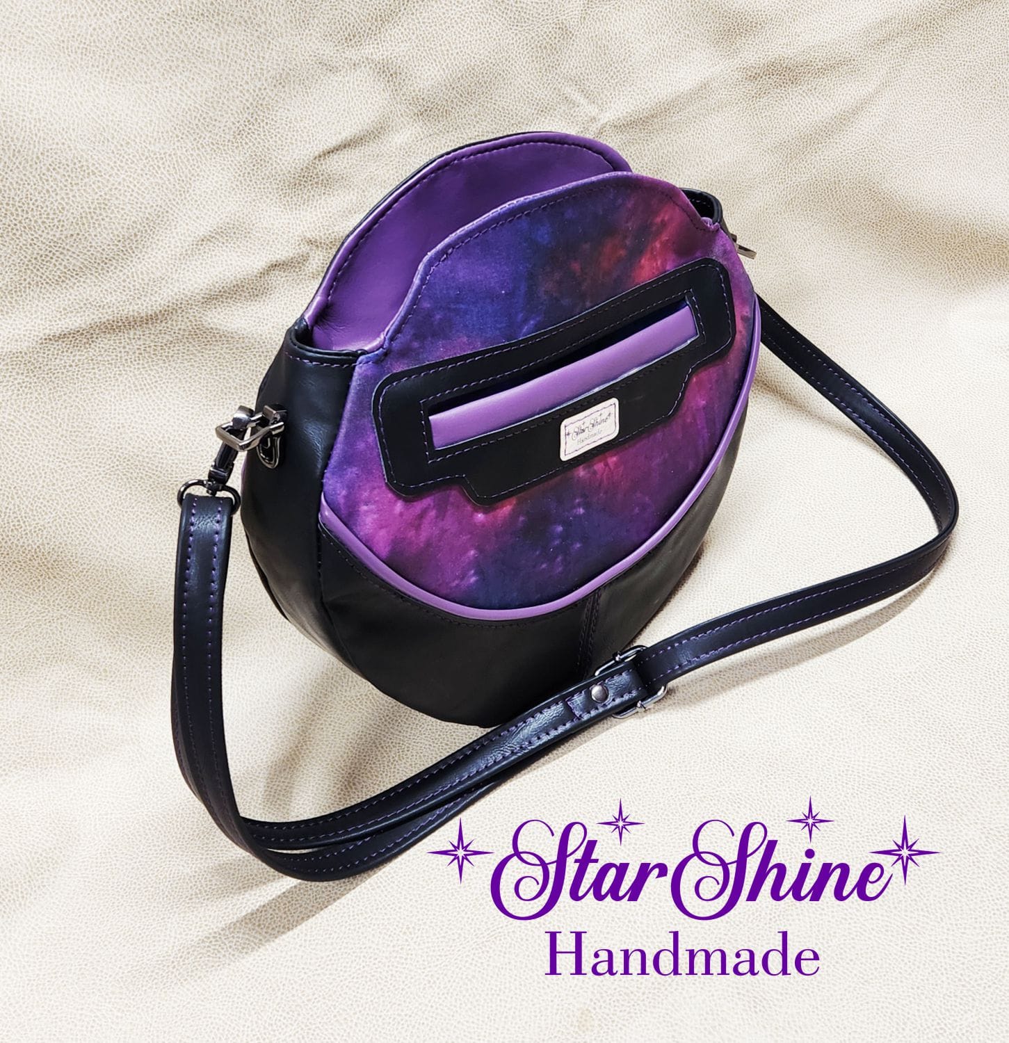 Purple and Black Anoukis Crossbody. This sassy and unique medium crossbody bag features a water/stain resistant marbled blue and purple cotton woven material. The front panel showcases an image of a brightly colored sassy girl giving the peace sign. The back has a welted slip pocket, ideal for storing your phone for easy access. Black faux leather sides and gusset and gorgeous purple faux leather piping accents that really pop. The black faux leather strap is removable and adjustable so it can be worn over the shoulder or crossbody style. This unique design and shape really stands out as a fun statement piece. Purple top stitching adds a complimentary accent.