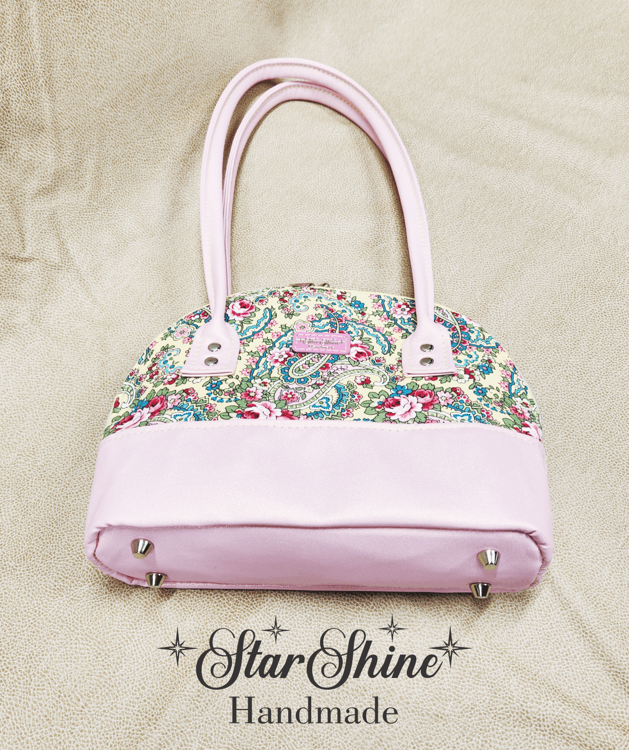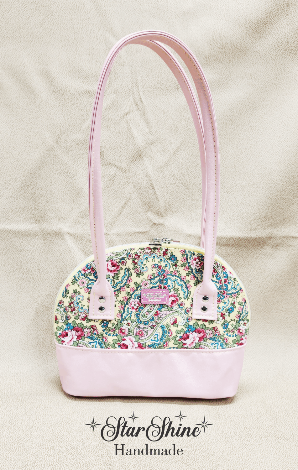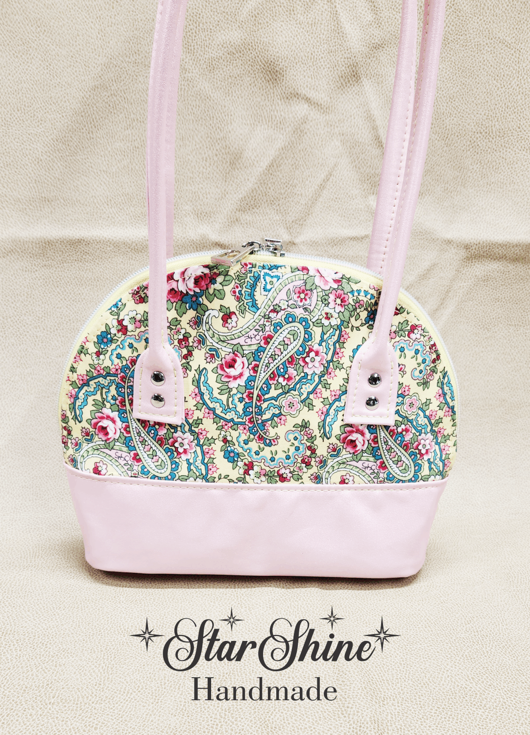 Yellow and Pink Paisley Floral Bowler. A classic and timeless beauty! Beautiful and colorful floral paisley print on a classic domed handbag. Light pink with golden luminescent shimmering faux leather accents and handles. Bag feet on the bottom to protect against dirty surfaces. Silver hardware. Dual zipper closures on yellow zipper tape with iridescent teeth.