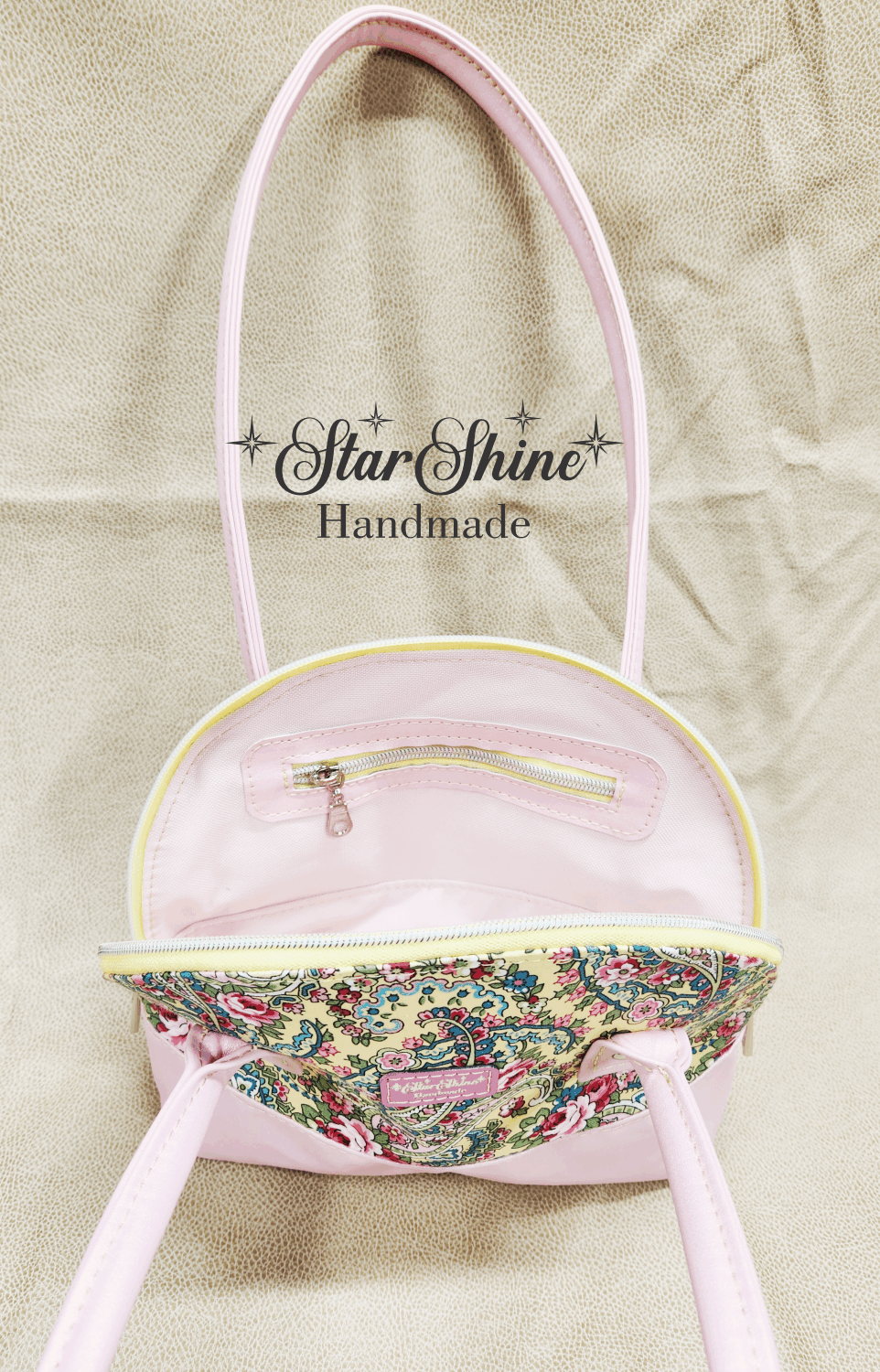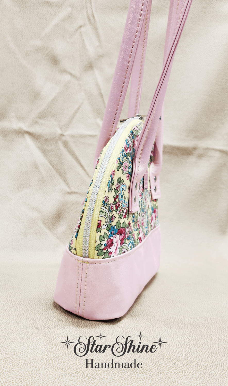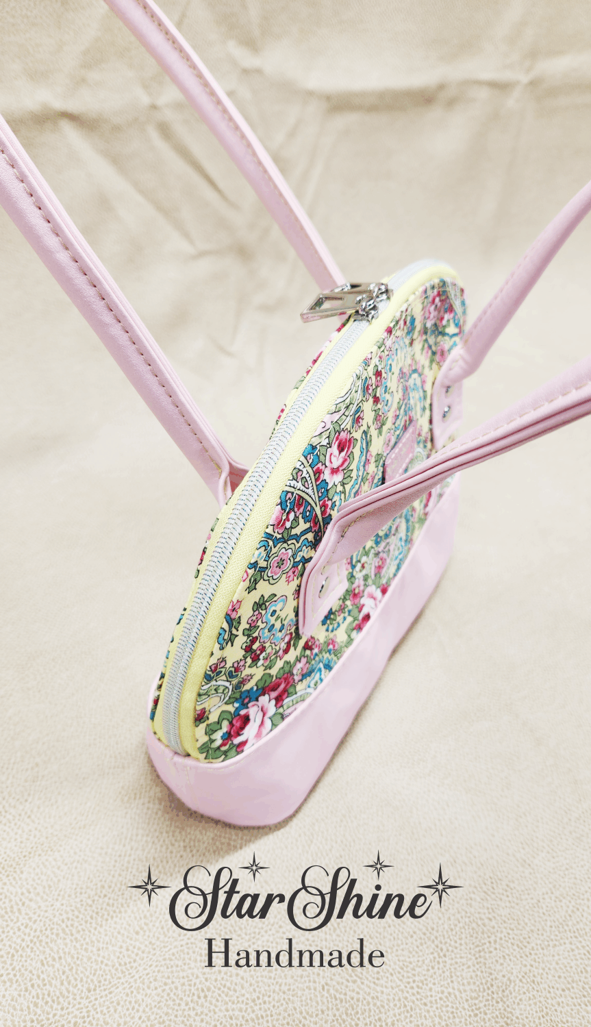 Yellow and Pink Paisley Floral Bowler. A classic and timeless beauty! Beautiful and colorful floral paisley print on a classic domed handbag. Light pink with golden luminescent shimmering faux leather accents and handles. Bag feet on the bottom to protect against dirty surfaces. Silver hardware. Dual zipper closures on yellow zipper tape with iridescent teeth.